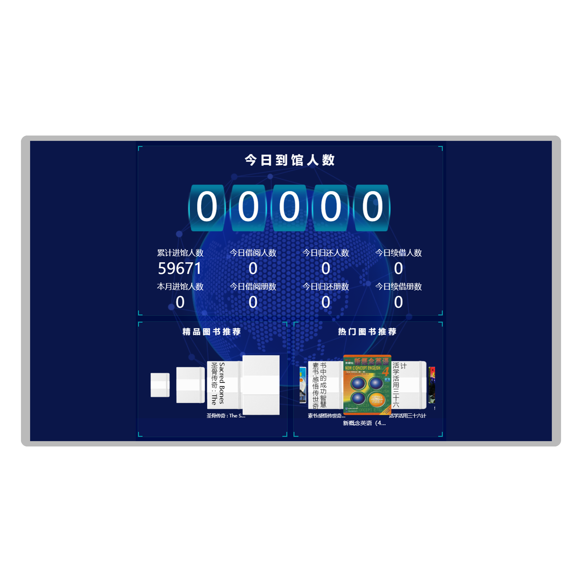 DGQZS43 / DGQZS56 大数据馆情展示平台能直观了解图书馆的借还书情况各个分馆之间的借阅 排行量,总借阅量、总办证量减少图书馆管理员去统计各馆借阅量的时间 , 有效提高图书馆的工作效 率及服务效率。能够实时编辑发布最新数据,实时展示图书馆进出馆人数、借阅排行榜、图书排行榜、 图书推荐、天气预报、图书馆资讯、名人名言等信息,还可以个性化定制信息展示。可用于图书档案、 金融通讯,影院 KTV、酒店餐饮、大型商超、政府、医疗医院、企业单位等场景。