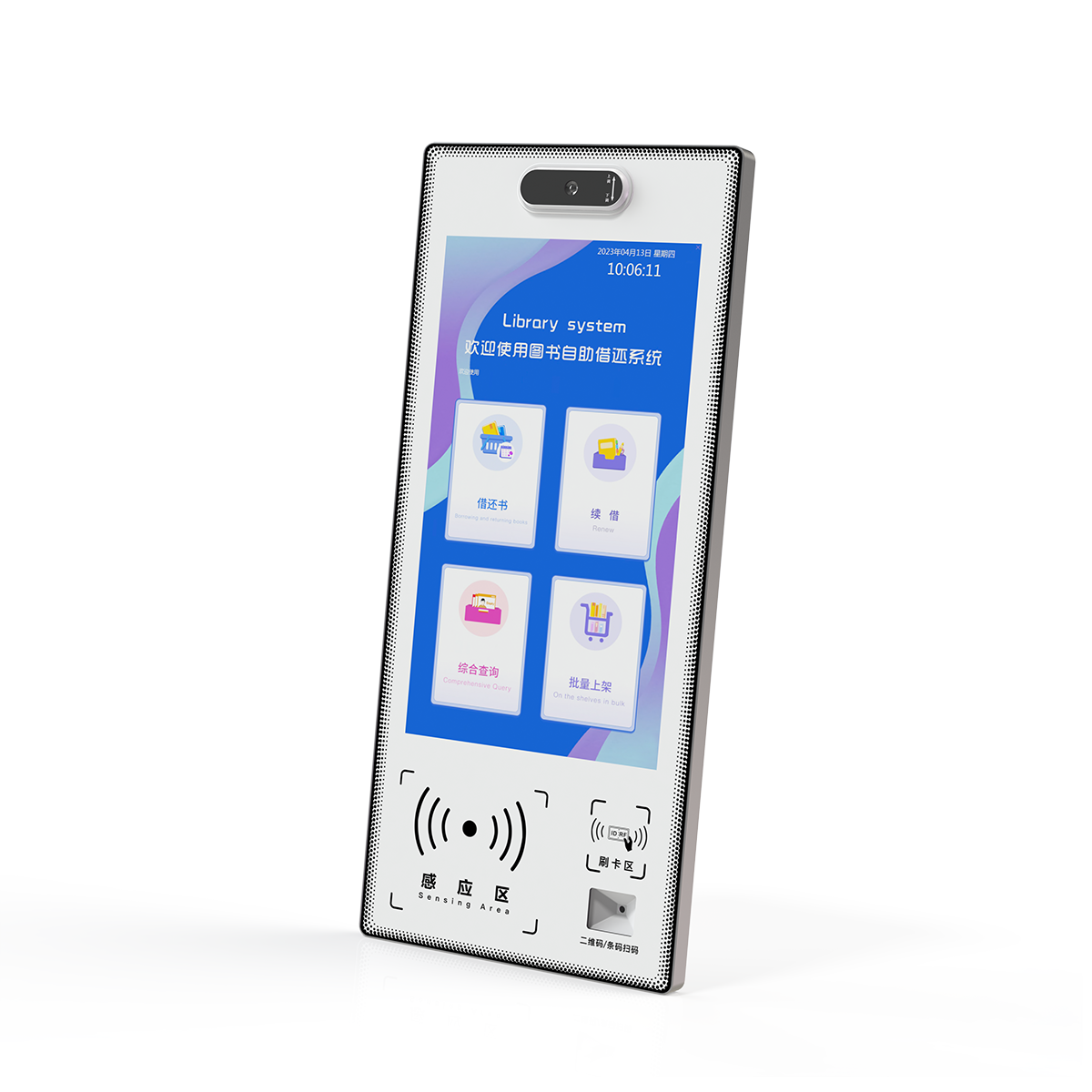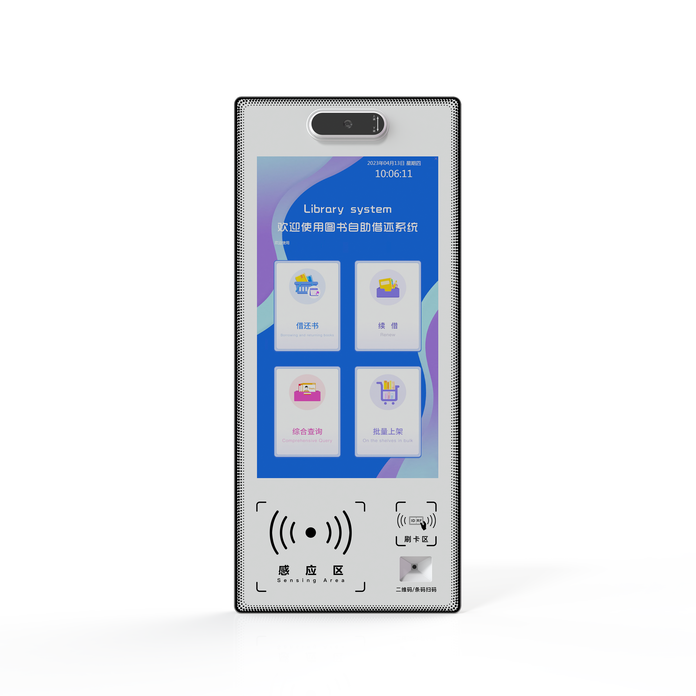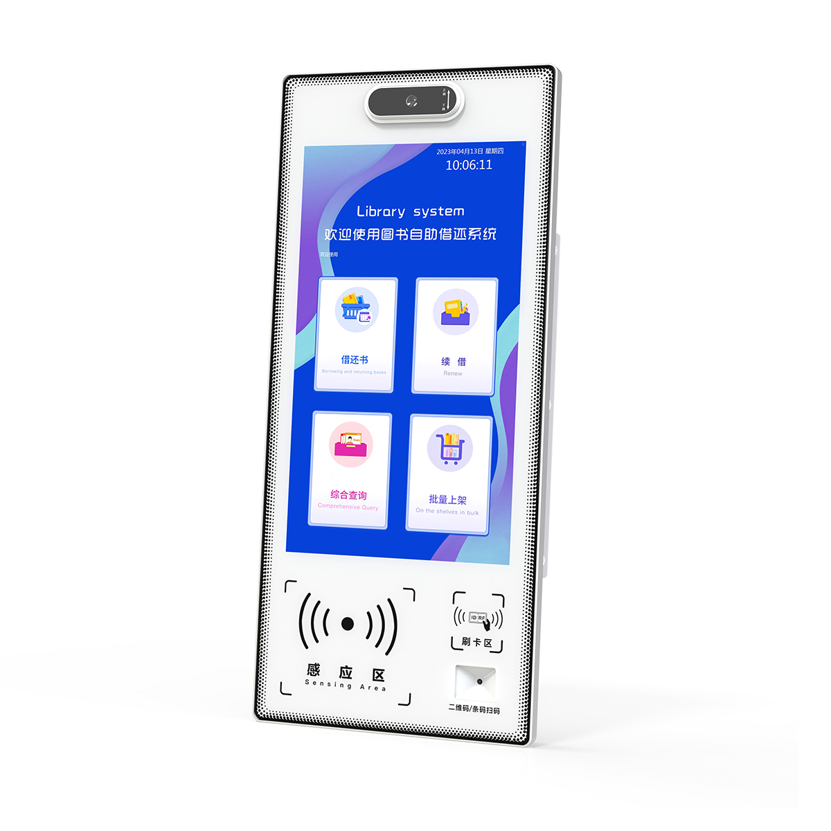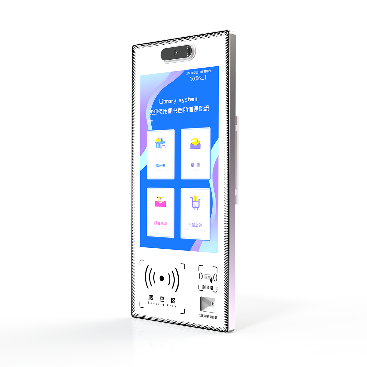 壁挂自助借还书设备,专为智慧图书馆设计,其配备触摸显示屏和简单操作的人机交流界面、图形界面,通过协议或其他网络及专用接口与图书馆自动化系统数据相连接。由读者自行借还馆内书籍资料,帮助图书馆在有限的人力资源条件下,增进图书流通速率、简化借还流程,快速准确的借还方式,进而提高图书馆从业人员工作效率及服务品质的一种自助设备。