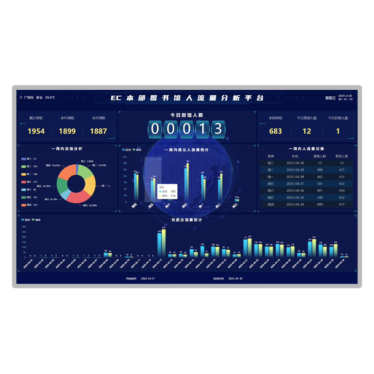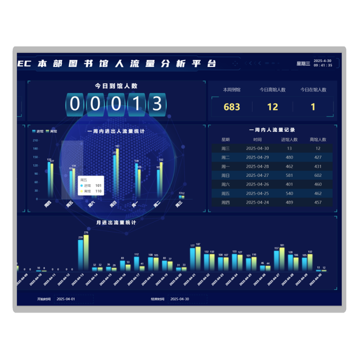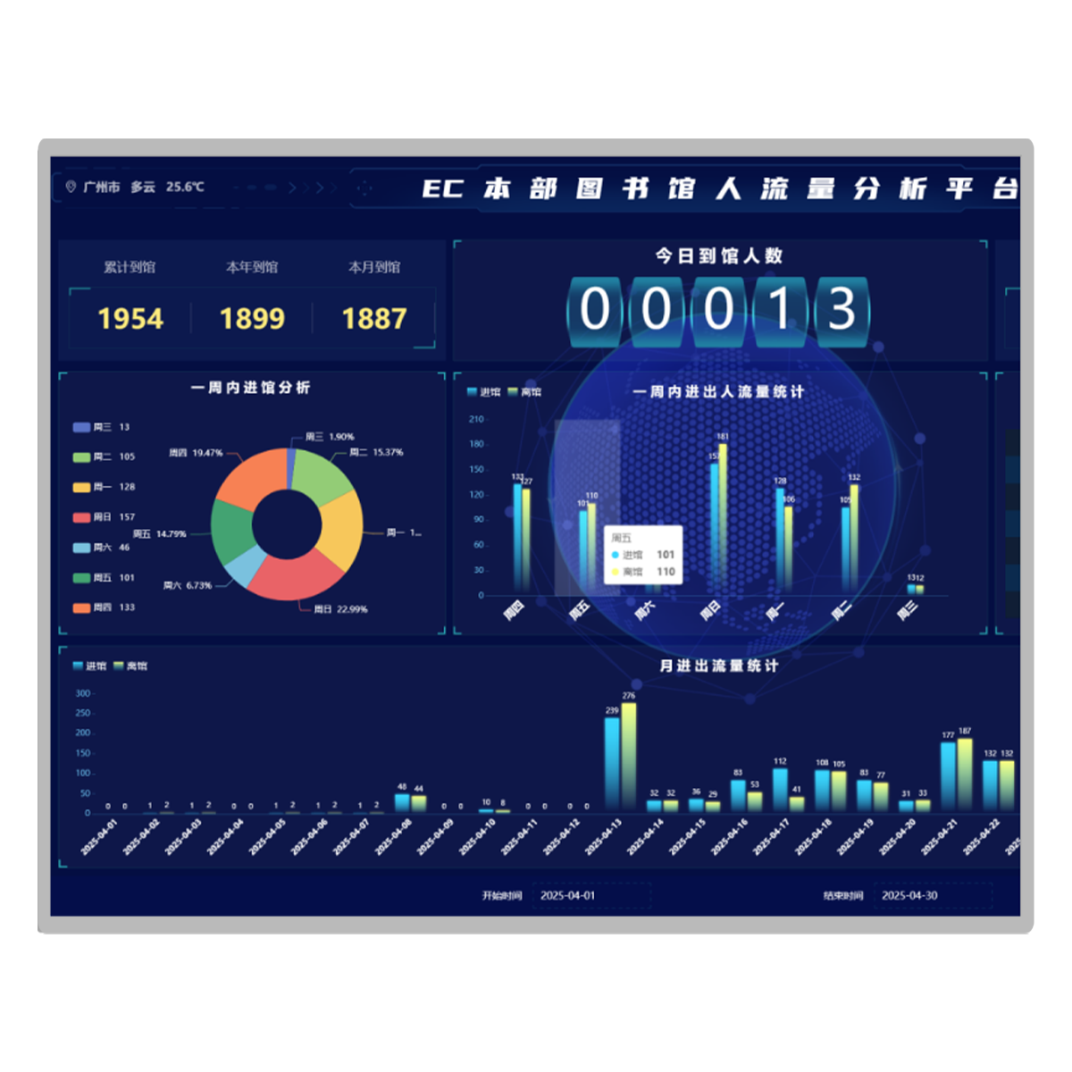 4、人流量分析系统上部左边,可统计本图书馆累计到馆人数,本年到馆人数,本月到馆人数。