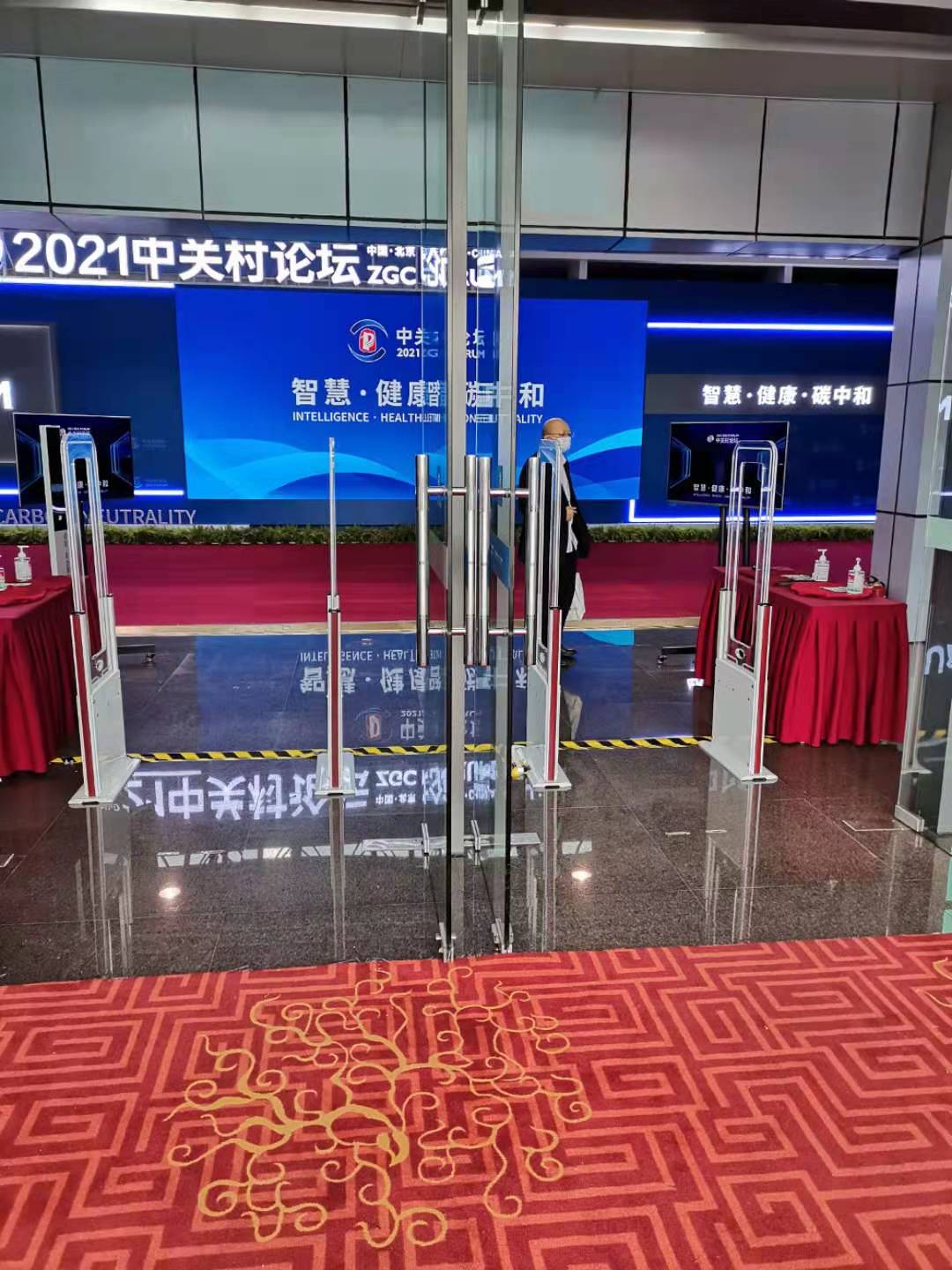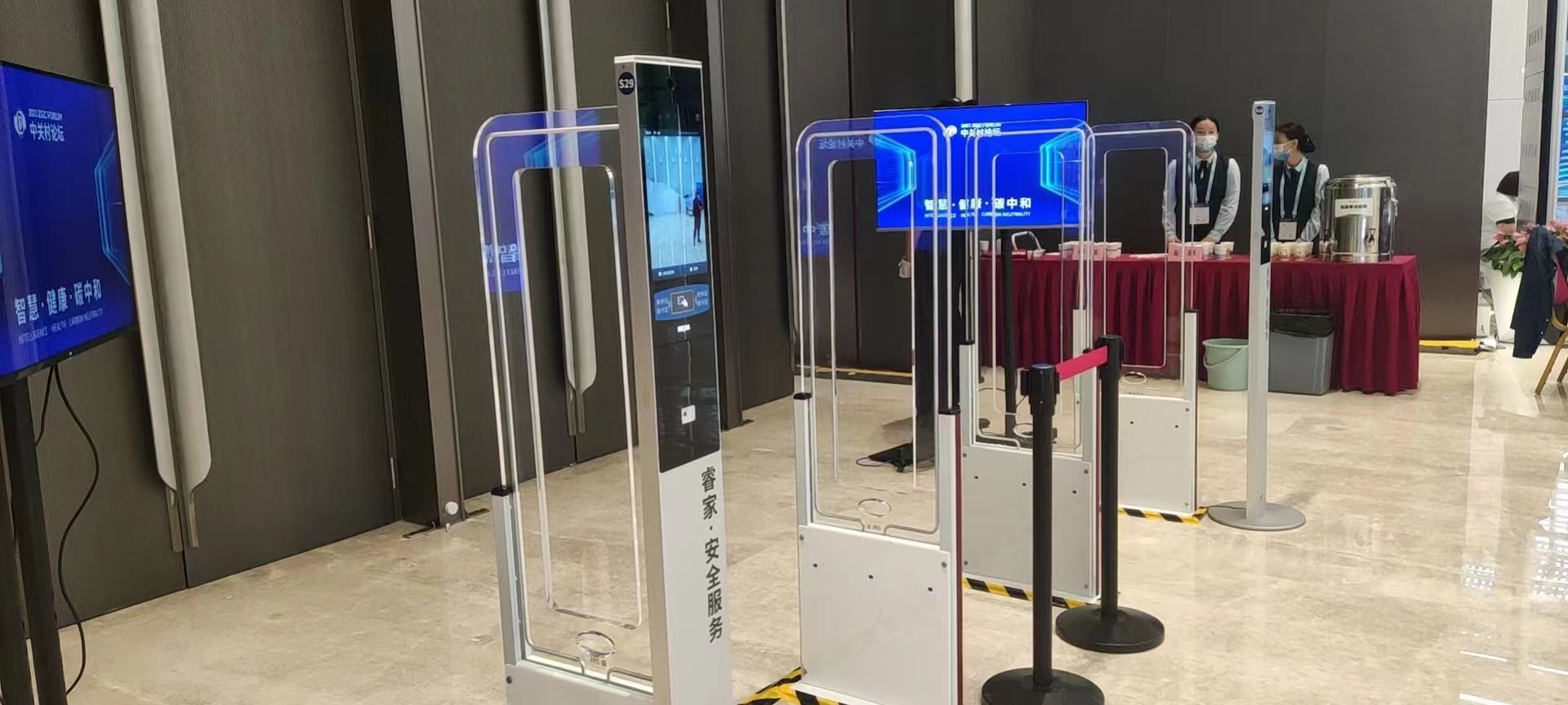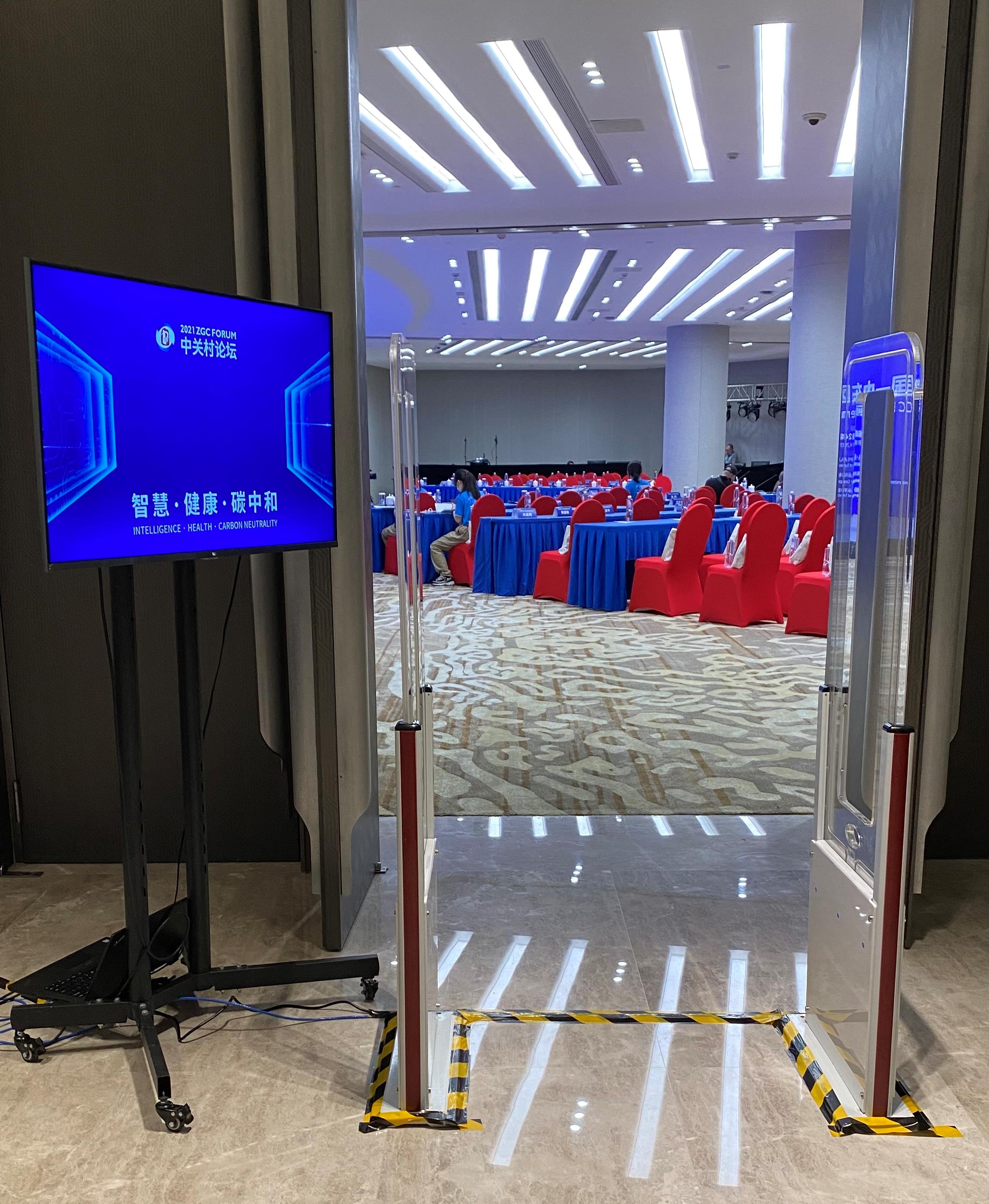 会议大厅门口摆放了单通道无障碍智能签到门,一分钟能快速识别通过100-200人。
